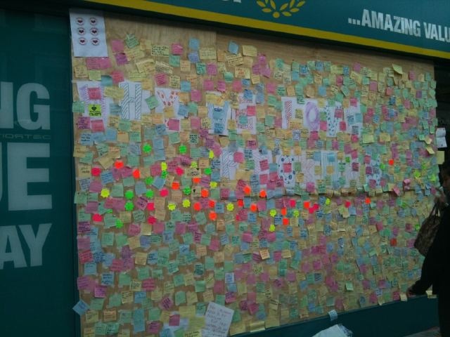 Ordinary decent people are feeling it too. I’ve seen several almost exaggerated acts of courtesy and consideration between people of all colours and classes on my way to and from work. Pausing to let each other pass, small acknowledgements and hesitant smiles. In these acts people are trying to say “It’s ok, we’re ok.” Post it notes on a boarded up shop eulogise our area and criticise the yobs. A volunteer army came out armed only with brooms to clean up.