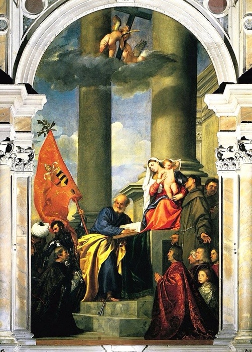Rather than limiting himself to the beautiful symmetry and positioning of figures which Raphael had perfected, Titian allowed himself asymmetry. But he balanced it through pure, beautiful and powerful colour – a simple flag for example balances the Pesaro Madonna above.