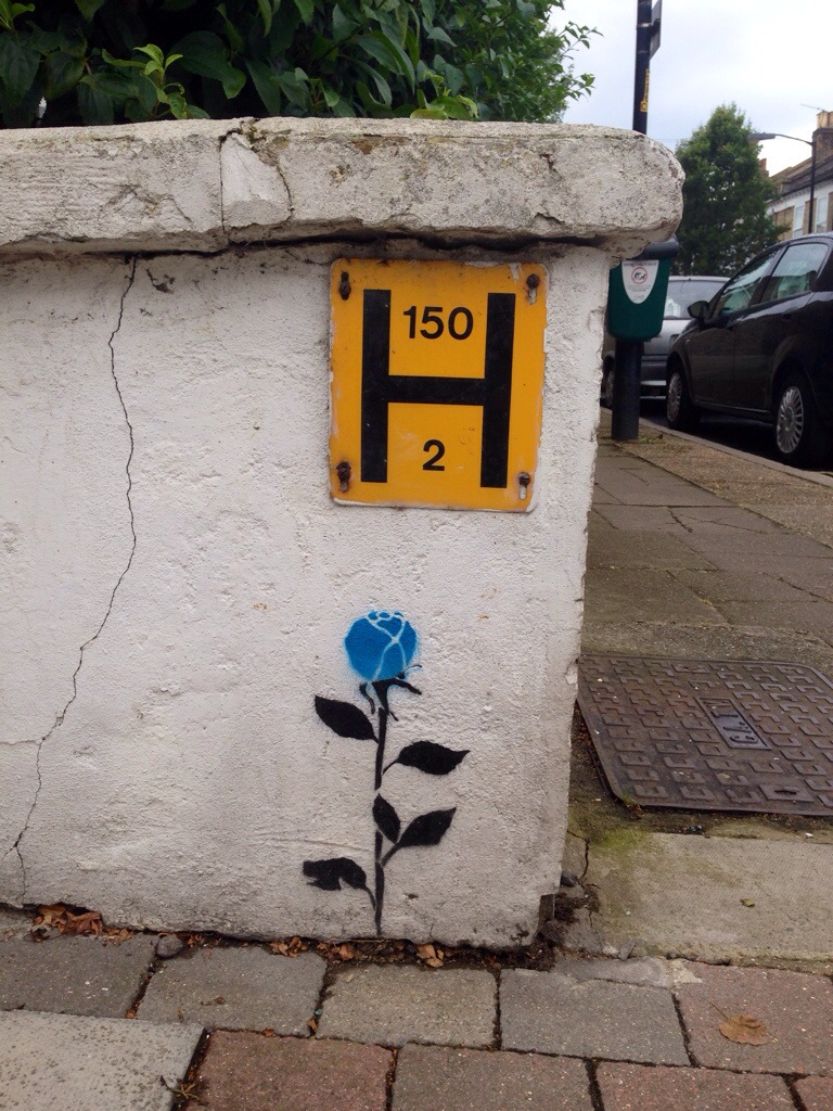 And it’s been going on for years, under our very noses where we live. We have a stencilled rose on the wall next to our house and ‘guerrilla gardeners’ transforming railway embankments and street trees all around us with flowers and planting.