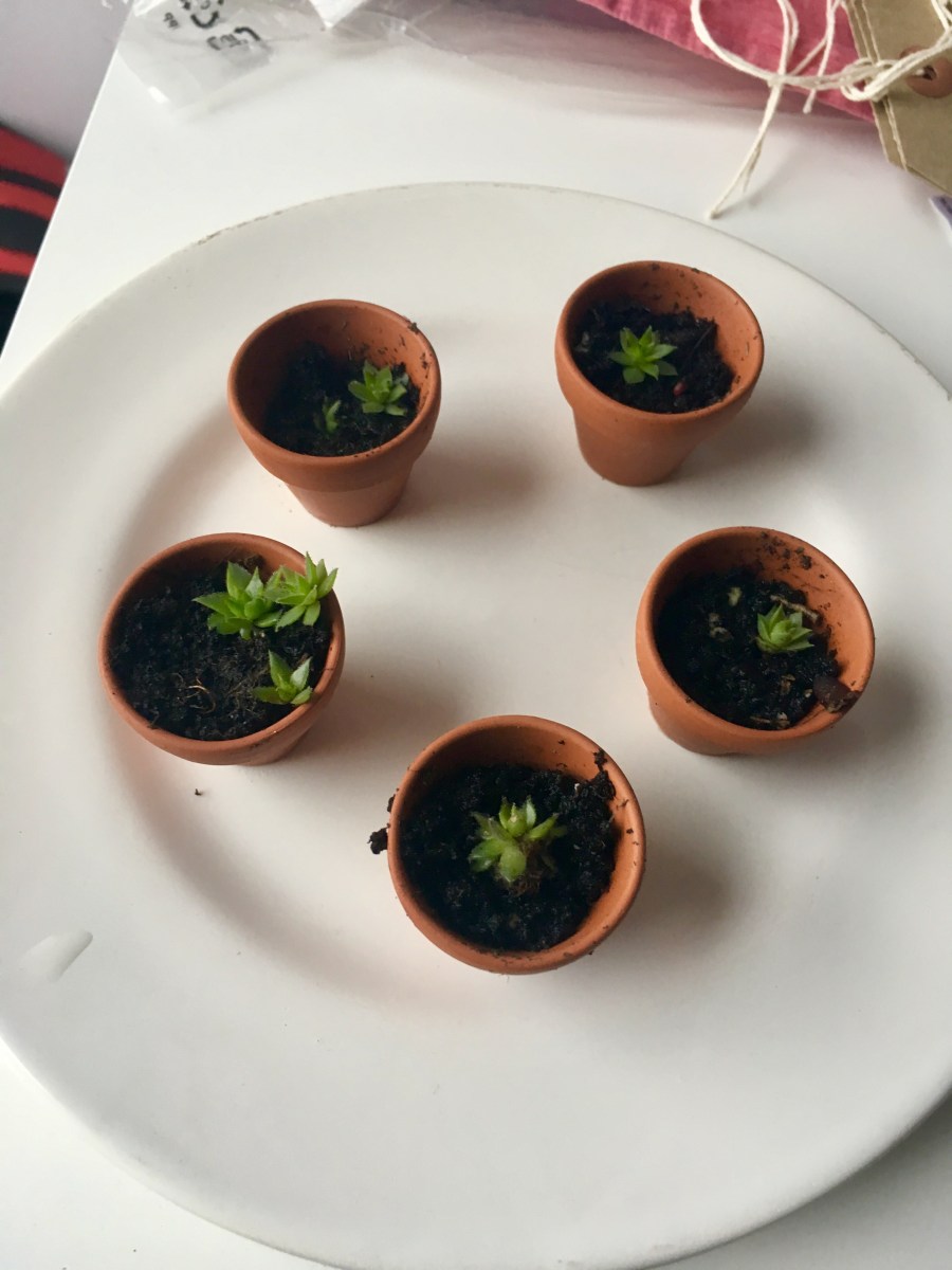 A couple of weekends ago (adding to my Christmas bonsai and January’s tiny cactuses from Amazon) I potted up some tiny fragments from a tray of forgotten succulents. They were struggling through the winter under a tree, in our slightly unloved back garden.